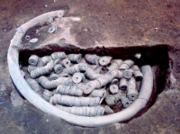 中野市内では中世の埋納銭が15ヶ所から発見されています。一地域でこれほど集中することは少なく、全国的にも埋納銭の発見が多いまれな地域です。その発見の歴史は江戸時代の慶応年間から1995年(平成7年)におよび、耕作中などに偶然発見されたものがほとんどです。1989(平成元年)・1995年(平成7年)の西条・岩船遺跡の市教育委員会による発掘調査での相次ぐ発見は、出土状態が明確な資料として重要です。これによって、一差しの枚数や銭種別構成などが明らかになりました。