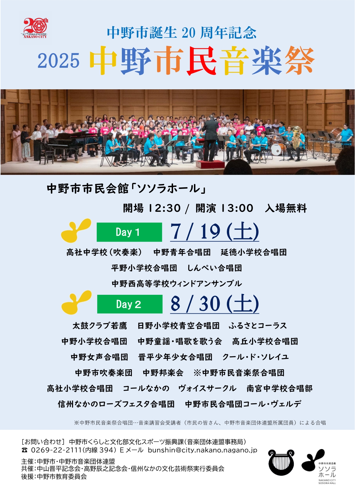 リニューアルオープンした市民会館ソソラホールの大ホールにおいて、2025中野市民音楽祭を2日間に分けて開催します。