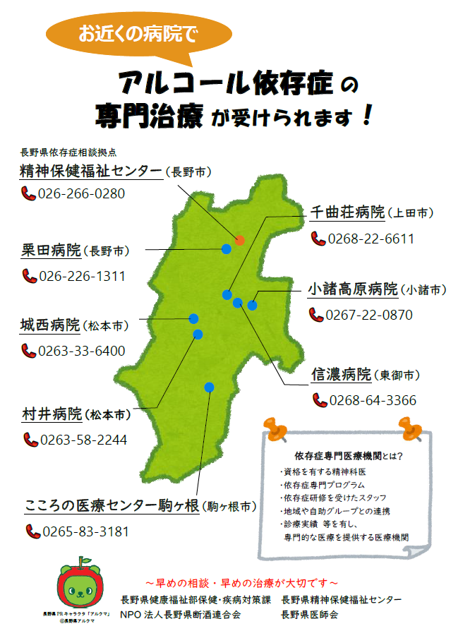 長野県では、アルコール健康障害、薬物依存症、ギャンブル等依存症の患者が適切な医療を受けられるようにするため、依存症専門医療機関及び依存症治療拠点機関等を指定しています。