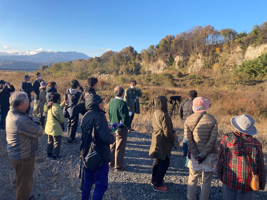 オンライン講演終了後十三崖対岸の河川敷に移動し、十三崖の現状について学芸員の本村から説明を行いました。