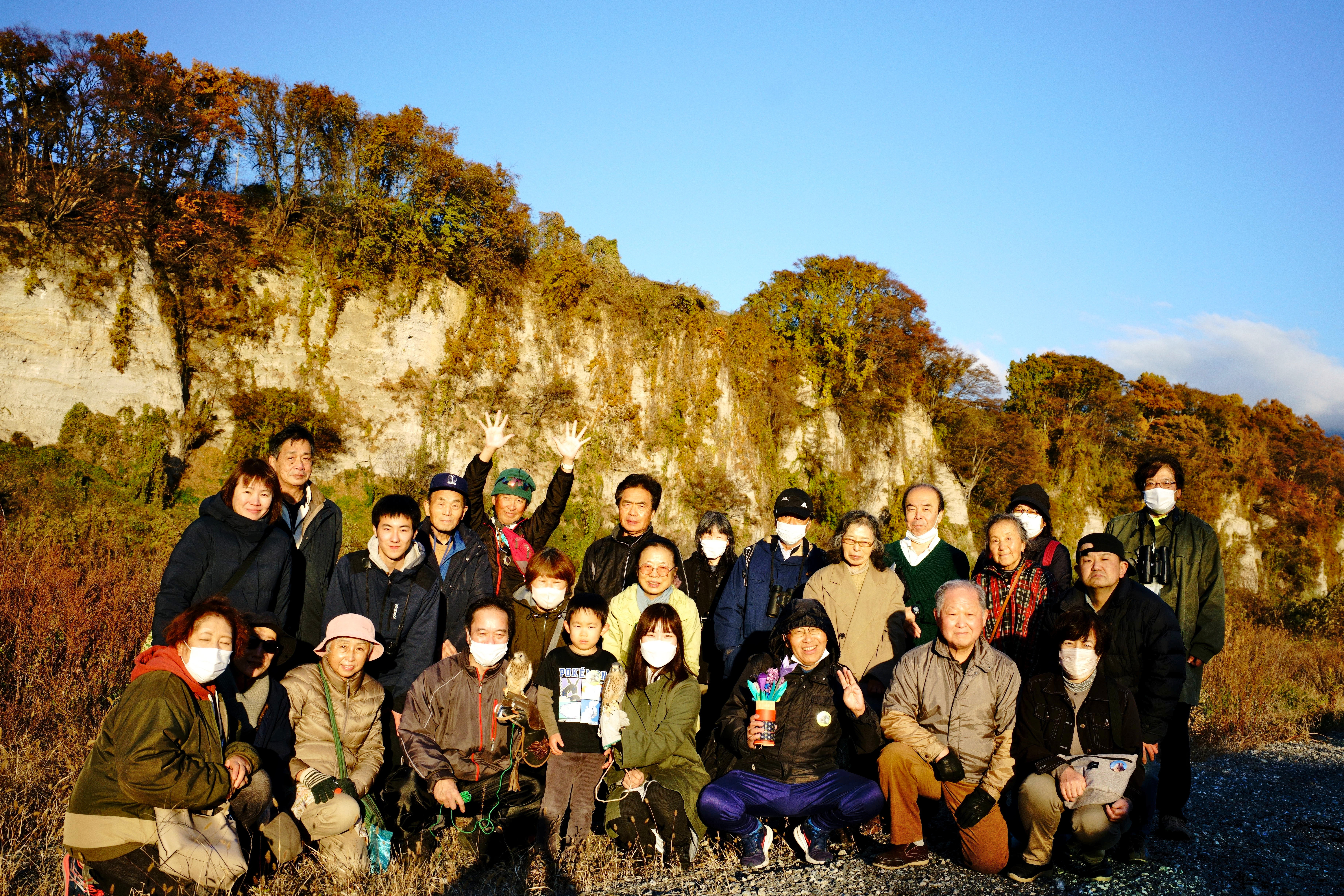 説明終了後、参加者の皆さんと傷病のため十三崖チョウゲンボウ応援団で保護飼育している個体と記念撮影を行い、勉強会は終了しました。当日は天気も良く、参加者の皆さんには「十三崖のチョウゲンボウ繁殖地」について理解を深めていただける機会となったと思われます。