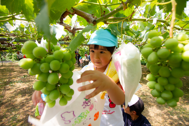 この体験は、ブドウ作りの作業を通して楽しみながら地産農産物への理解を深めてもらうために、JA中野市と同ぶどう部会が企画。園児たちは、部会員による「なぜ袋をかけるのか」などの説明を受けた後、大人たちの手を借りながら、自分たちが描いたオリジナルの袋をブドウに掛け、秋の収穫を楽しみに園地を後にしました。